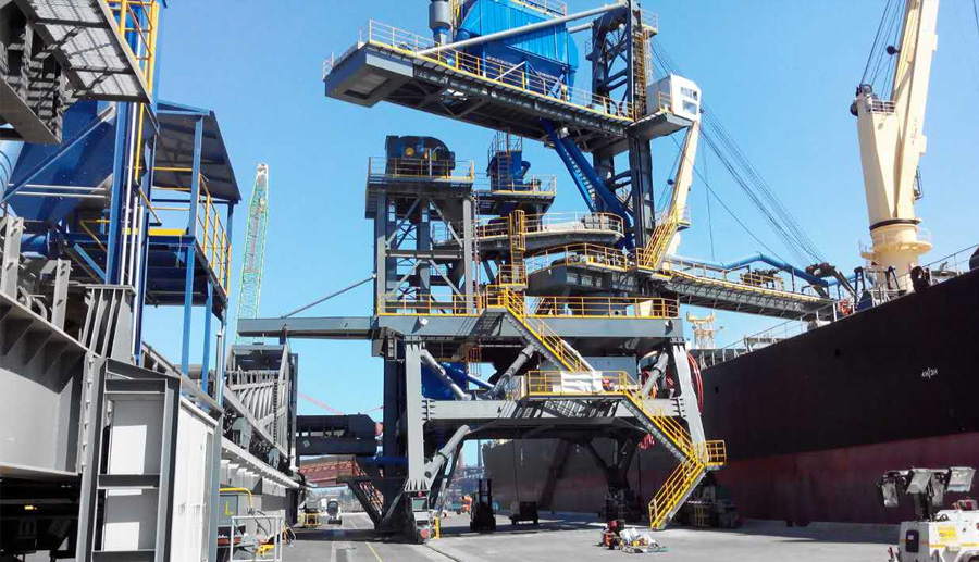 無軌道移動式裝船機(jī),行走裝置有輪胎、履帶兩個系列,物料進(jìn)入裝船機(jī)的方式有:1)自卸卡車直接倒料的進(jìn)料裝置,每套進(jìn)料裝置的接受能力為625m3/h,弧形懸臂式可配置兩套進(jìn)料裝置,裝船能力達(dá)到1200m3/h,塔式可配置四套進(jìn)料裝置,裝船能力達(dá)到2400m3/h;2)裝載機(jī)進(jìn)料的料倉;3)皮帶機(jī)進(jìn)料的料斗。有軌道移動式裝船機(jī),如圓弧軌道式、直線軌道式、前直線軌道擺動和后直線軌道擺動。對于水文落差較大的碼頭,采用在浮式躉船安裝1-2臺圓弧軌道式,直線軌道式需要配置相應(yīng)的尾車輸送機(jī),擺動式裝船機(jī)適用于環(huán)保要求較高的碼頭,采用大跨距的回轉(zhuǎn)橋架,完成長大艙口的覆蓋面積。對于船型很小或移船方便的碼頭,為減少投資,可選用墩座式裝船機(jī)。袋包裝船有螺旋滑槽式和托輥式。