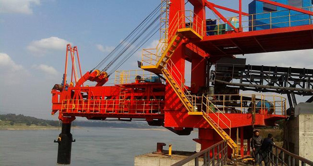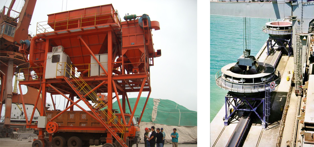 無軌道移動式裝船機(jī),行走裝置有輪胎、履帶兩個系列,物料進(jìn)入裝船機(jī)的方式有:1)自卸卡車直接倒料的進(jìn)料裝置,每套進(jìn)料裝置的接受能力為625m3/h,弧形懸臂式可配置兩套進(jìn)料裝置,裝船能力達(dá)到1200m3/h,塔式可配置四套進(jìn)料裝置,裝船能力達(dá)到2400m3/h;2)裝載機(jī)進(jìn)料的料倉;3)皮帶機(jī)進(jìn)料的料斗。有軌道移動式裝船機(jī),如圓弧軌道式、直線軌道式、前直線軌道擺動和后直線軌道擺動。對于水文落差較大的碼頭,采用在浮式躉船安裝1-2臺圓弧軌道式,直線軌道式需要配置相應(yīng)的尾車輸送機(jī),擺動式裝船機(jī)適用于環(huán)保要求較高的碼頭,采用大跨距的回轉(zhuǎn)橋架,完成長大艙口的覆蓋面積。對于船型很小或移船方便的碼頭,為減少投資,可選用墩座式裝船機(jī)。袋包裝船有螺旋滑槽式和托輥式。